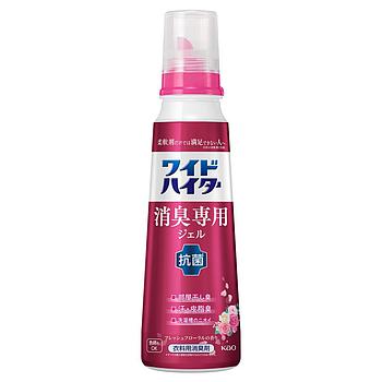 Дезодорирующий гель KAO Wide Haiter для белья против неприятного запаха тщательно дезодорирует 7 основных запахов, таких как запах сушки в помещении, запах пота/кожного жира, запах белья, запах полусухого белья, запах носков, запах старения и запах еды. Добавьте к обычному моющему средству, гель быстро растворяется в воде. Обладает антибактериальным эффектом. Подходит для цветного белья и вещей с рисунками. Дезодорант для одежды (без отбеливателя). Великолепный свежий цветочный аромат.