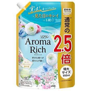 Серия кондиционеров Aroma Rich от LION считается самой "ароматной", если по шкале от 1 до 7 звезд классический Soflan получил 3 звездочки за выраженность запаха, то у Aroma Rich - наивысший бал - 5 звездочек из 7. Тем не менее для наших широт этот запах все равно легкий и уловимый только с очень близкого расстояния при движении, одежда обработанная этим кондиционером пахнет очень приятно на протяжении всего дня.