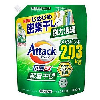 Жидкое средство для стирки "Attack EX" (концентрат): сменный блок 2030 г с крышкой. Для сушки белья в помещении. Мощное дезодорирование даже при сушке во влажном, многолюдном месте. Постоянное антибактериальное действие до полного высыхания. Защита от плесени в баке стиральной машины. Уменьшает количество вирусов, прикрепляющихся к одежде. Можно также использовать для сушки на улице. Одно полоскание. Можно использовать с оставшейся водой. Аромат солнечной зелени. Также можно использовать кондиционер для белья и отбеливатель для белья (на основе кислорода).