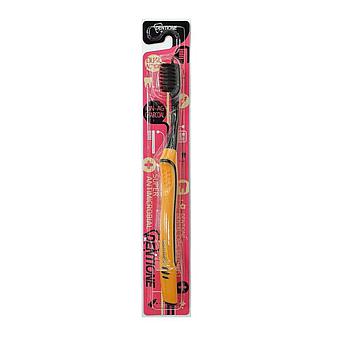 Щетина зубной щетки изготовлена из полибутилентерефталата, не впитывающего воду и пасту, обработана древесным углем, соз- дающим инфракрасное излучение, которое обладает антибактериаль- ным эффектом и отлично справляется с бактериальным налетом в полости рта. Мягкие сверхтонкие щетинки и более упругие щетинки второго слоя глубоко проникают в зубно- дёсенное пространство, бережно полируют поверхность зуба, эффективно удаляя зубной налёт и остатки пищи. На поверхности щетинок не размножаются микроорганизмы. Средняя жесткость позволяет использовать зубную щётку для чистки чувствительных зубов и дёсен.
