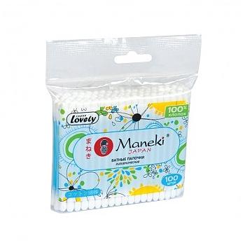 Палочки ватные гигиенические Maneki, серия Lovely, с голубым пластиковым стиком, в zip-пакете, 100 шт./упак