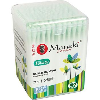 Палочки ватные гигиенические MANEKI Lovely, с зеленым стиком, в пластиковой коробке, 150 шт.