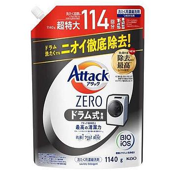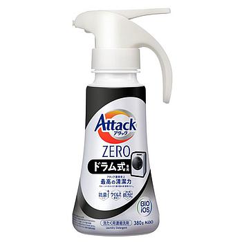 Жидкое средство для стирки KAO Attack ZERO (суперконцентрат, с защитой от повторного оседания грязи при стирке) разработано специально для барабанного типа стиральных машин, он содержит водосберегающие полимеры, которые предотвращают повторное появление пятен на одежде. Тщательно удаляет запахи в стиральной машине. Удаляет очаги бактерий. Антибактериальное и противовирусное средство, противодействие плесени в баке стиральной машины. Без добавления оптического отбеливателя. Кроме того, оно содержит чистящий ингредиент Bio-IOS, целью которого является достижение как «высокой очищающей способности», так и «экологичности». Эффективно подавляет накопление пятен полисахарида. Пятна полисахарида можно удалить повторной стиркой. Помимо антибактериальных свойств, оно контролирует метаболизм запахов бактерий.