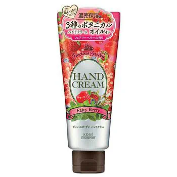 Самый популярный крем из линейки кремов для рук Fairy Berry от Kose - "Ягодная Фея". Питает, увлажняет и смягчает кожу рук, за счет содержания масла ши, масла жожоба, меда и, собственно, экстракта ягод.